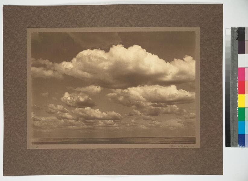 Large clouds over a forrest, a horse drawn wagon and horseback riders are in the foreground.