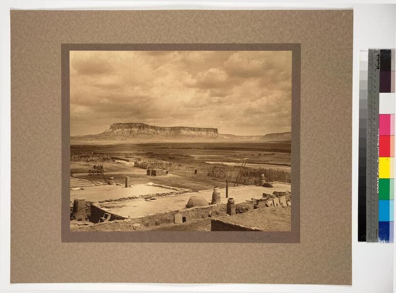 View of pueblo buildings on top of mesa, with desert beyond. A Hopi man is seen in the pueblo, at a distance.