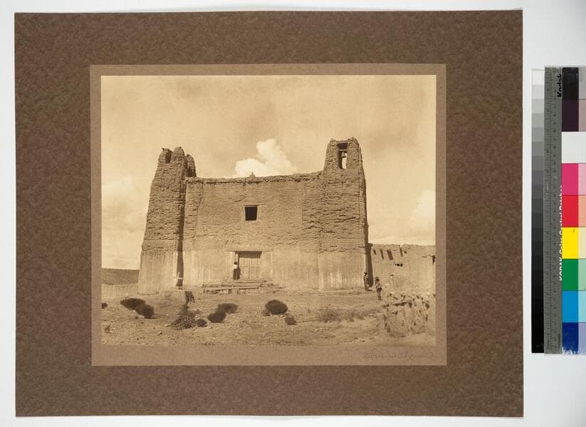 View of pueblo building on top of a mesa, a second mesa can be seen in the distance.