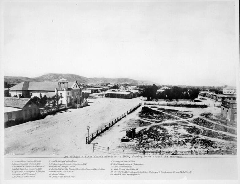 Elevated view from Fort Moore Hill (also known as Fort Hill) looking east towards the Los Angeles Plaza, with the three-story Pico House, at right, and the bell tower of the Plaza Church, at left, among the visible buildings.