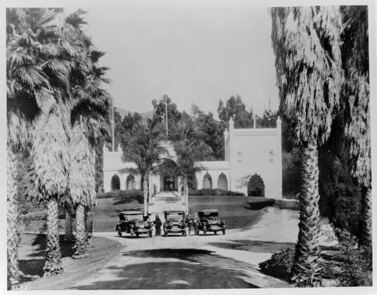 View of the north side of the Huntington residence, taken from the bottom of the north vista through a gap in the trees. The fountain in front of the north entrance has been installed. MS notes on verso read "HEH residence: north facade" and "Dup of 47."