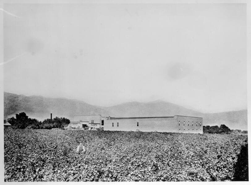 View of a vineyard in the foreground, with winery, and other outbuildings in the distance on the Sunny Slope ranch owned by L. J. Rose in San Gabriel, California.