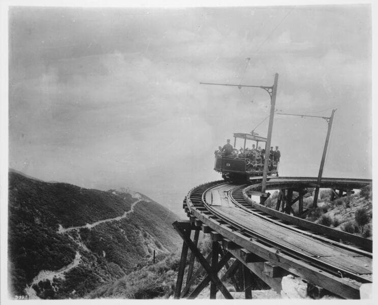 Passengers on car on circular bridge, Echo Mountain House and Observatory to the left.