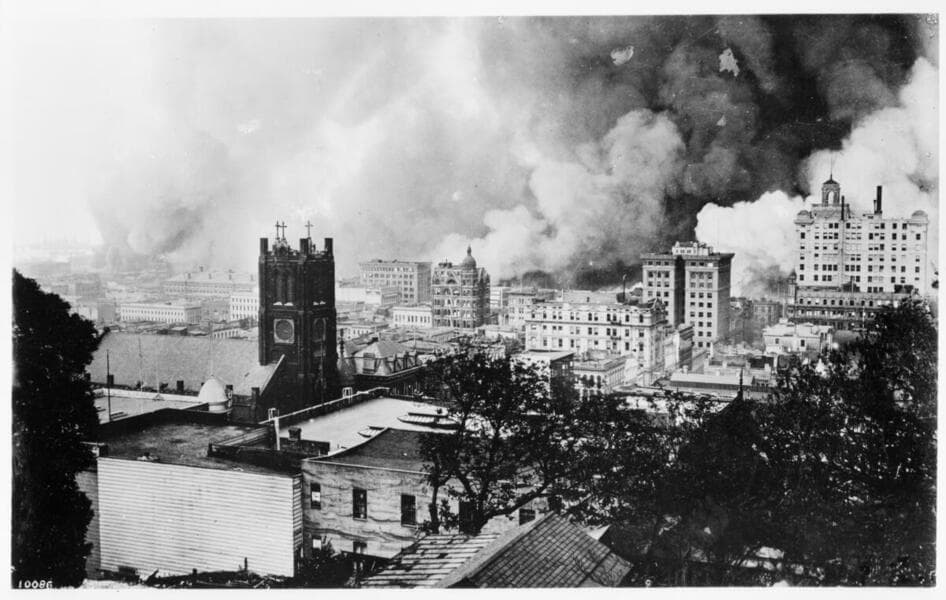 127 black-and-white photographs mounted on album boards documenting the ruins and damage following the 1906 San Francisco earthquake and fire and primarily showing the damaged exteriors of buildings in San Francisco and at Stanford University in Palo Alto, California. The photographs were commissioned and originally owned by Robert C. Jordan who helped rebuild the city. The photographer is unknown.