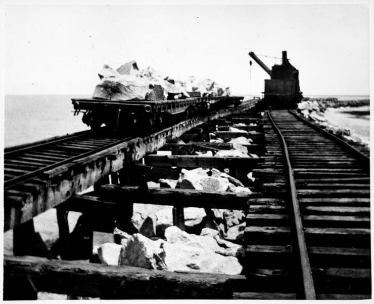 Photo of a man and railroad crane on trestle next to the rocks of the breakwater.