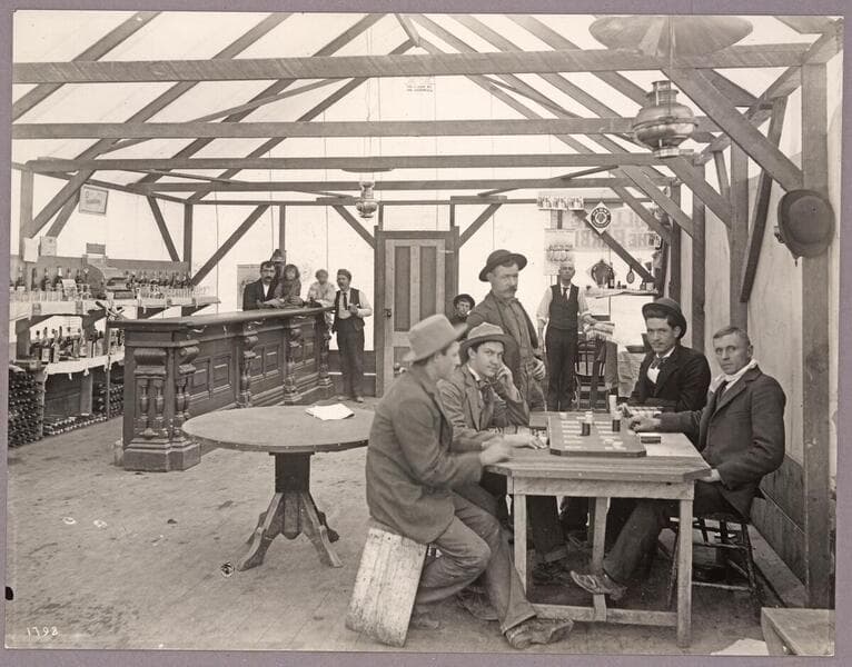 [Virginia City, Nevada, a saloon interior and 3 men]
