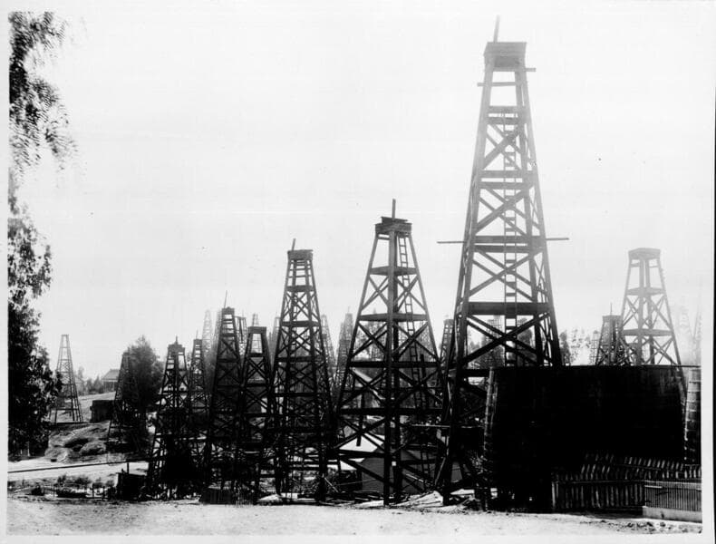 Image of oil derricks and dwellings in the oil fields north of downtown Los Angeles, California, at the corner of Belmont Avenue and First Street, with tanks that hold crude oil visible.