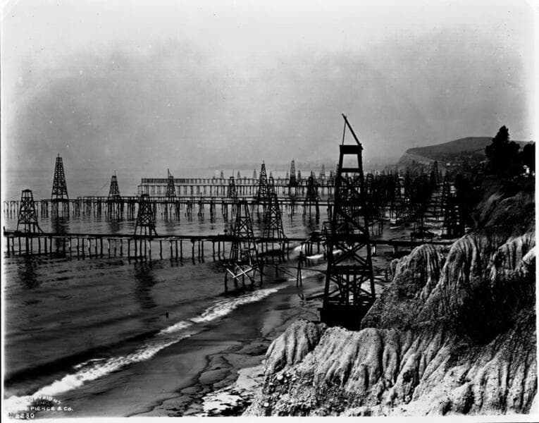 Series of oil wells along the Pacific coastline. Railroad tracks on the shore at left.