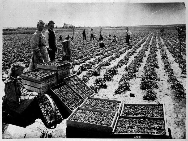 A group of men, women and children in a wooden structure with flats of cut fruit on the table and boxes of whole fruit.