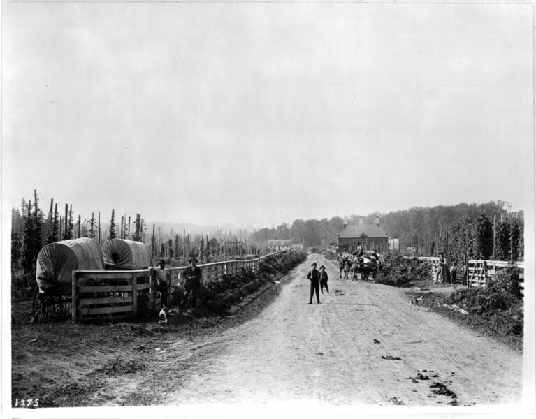 View of the road in front of the ranch of the Haas family in Los Angeles, California, with men, a woman, children, horses, and a wagon standing along the dirt road in the foreground, with trees and house behind a picket fence.