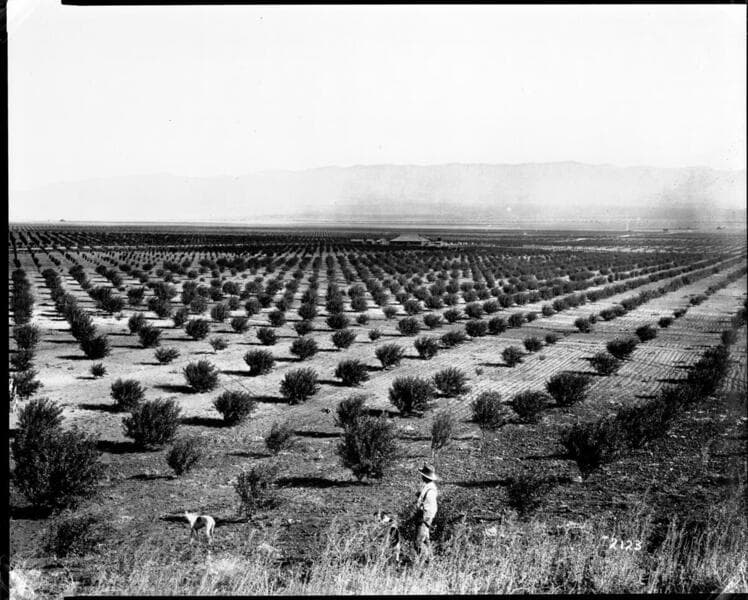Rows of orange trees run from foreground into the distance on the ranch of Anson Van Leuven (or Van Lenvan) in San Bernardino, California.