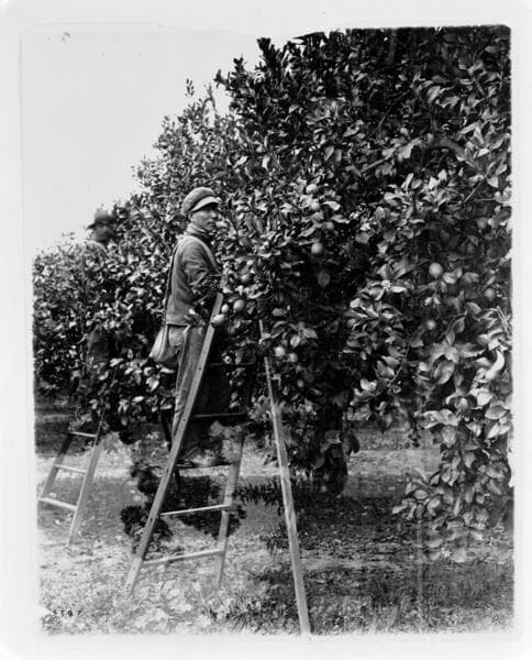 View of workers in an orange grove in Riverside, California, picking oranges from trees amid ladders and boxes of fruit crates lettered "Riverside Navel Orange Co."