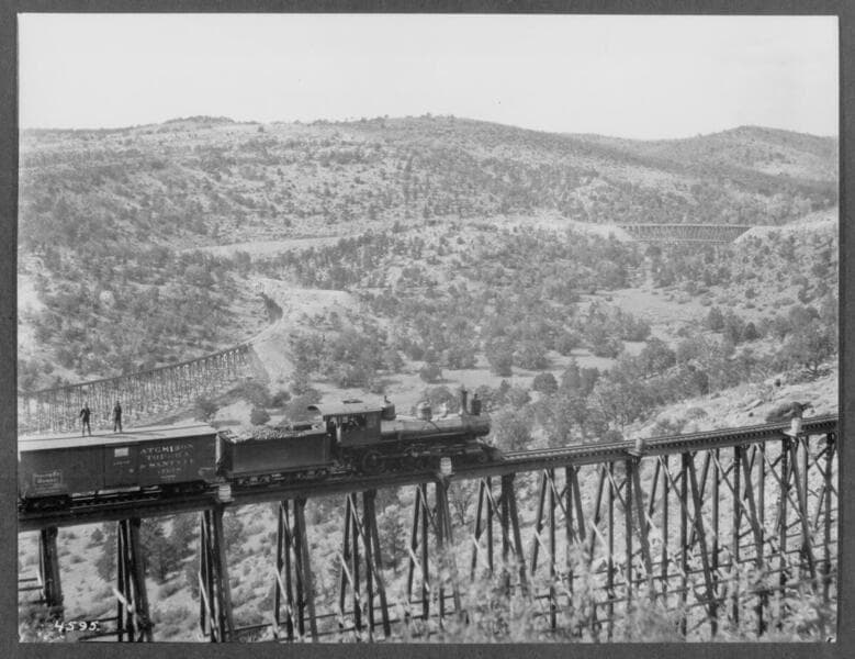 Train crossing trestle with figures seated and standing on trestle.