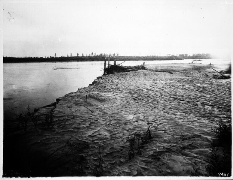 Looking down at buildings on the edge of the Feather River. The banks of the river and hillside are covered in rocks.