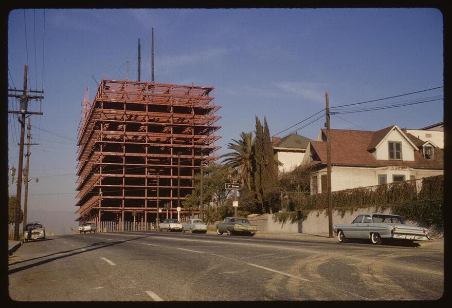 This collection consists of 35mm Kodachrome slides taken between 1954 and 1972. This collection of photographs taken by amateur photographer Palmer Conner documents by street the physical and social changes of Bunker Hill during the earliest stages of redevelopment. The collection is particularly strong in its depiction of the Bunker Hill neighborhood of downtown Los Angeles during redevelopment in the 1950s. Images chiefly consist of views of commercial and residential building exteriors taken from the street, including images of both new construction and older buildings in the process of being demolished.