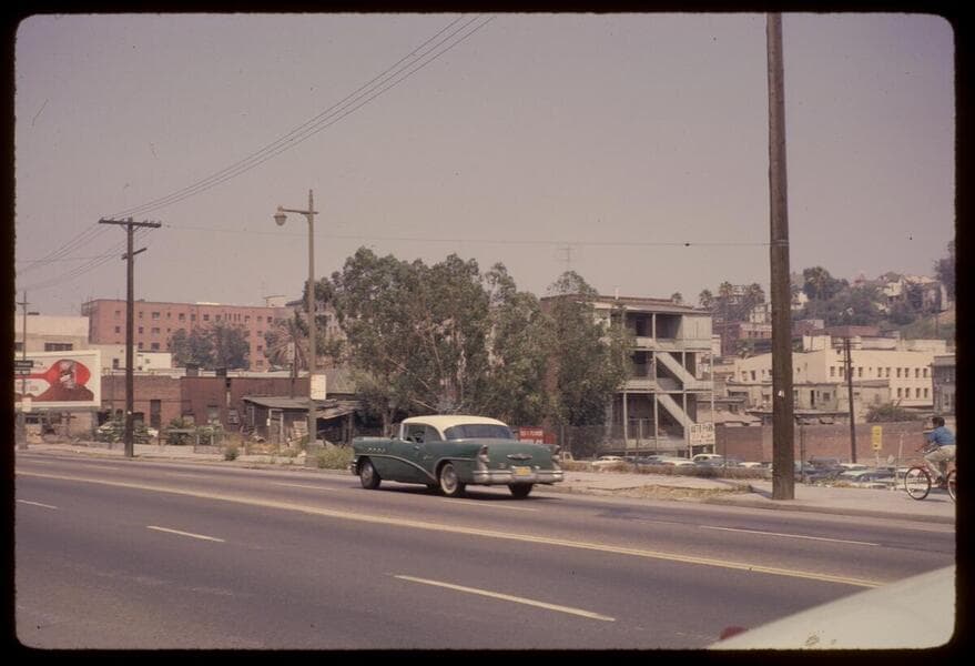 This collection consists of 35mm Kodachrome slides taken between 1954 and 1972. This collection of photographs taken by amateur photographer Palmer Conner documents by street the physical and social changes of Bunker Hill during the earliest stages of redevelopment. The collection is particularly strong in its depiction of the Bunker Hill neighborhood of downtown Los Angeles during redevelopment in the 1950s. Images chiefly consist of views of commercial and residential building exteriors taken from the street, including images of both new construction and older buildings in the process of being demolished.