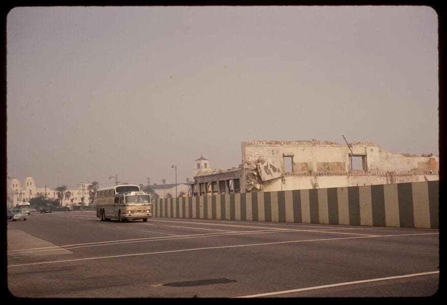 Metropolitan Coach Line bus passing by the once three story Downey Building being demolished at 330 North Main Street, Los Angeles. Hadley Building is visible at left background.