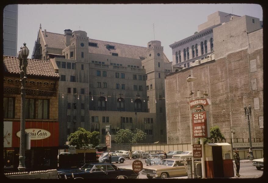 View of the the neoclassical style Pacific Mutual Building at 523 West 6th Street. The Italian Renaissance Hotel Savoy sat across the street at the northwest corner of 6th Street and Grand Avenue.