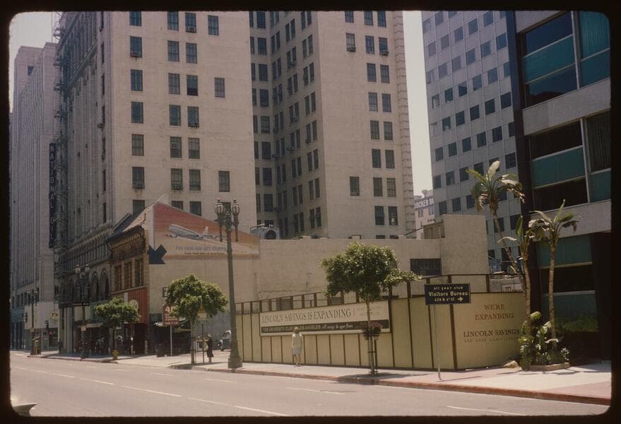 East along 6th Street from Flower Street toward Hope Street. On the right is Mobil Oil/General Petroleum Building, 612 South Flower Street. Further east is the National Oil Building, 609 South Grand Avenue. Background skyscrapers under construction are the City National Bank on the left and One Wilshire right of cente.