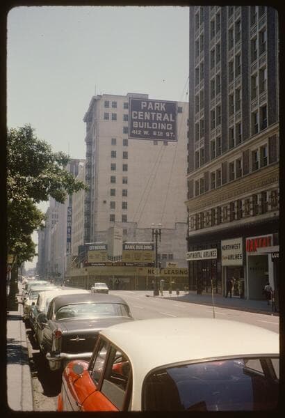 The Acacia Hotel, 708 West 6th Street, offered temporary apartments. Looking east on 6th Street toward the intersection of Hope Street. The 1947 General Petroleum Building is at the far right. The Acacia Hotel is at the southwest corner of 6th and Hope Streets.