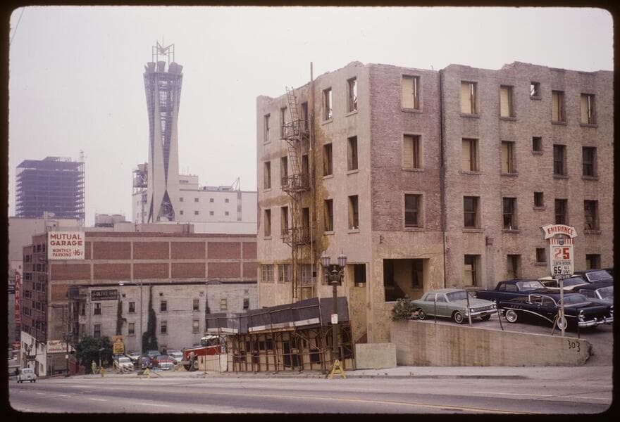 This collection consists of 35mm Kodachrome slides taken between 1954 and 1972. This collection of photographs taken by amateur photographer Palmer Conner documents by street the physical and social changes of Bunker Hill during the earliest stages of redevelopment. The collection is particularly strong in its depiction of the Bunker Hill neighborhood of downtown Los Angeles during redevelopment in the 1950s. Images chiefly consist of views of commercial and residential building exteriors taken from the street, including images of both new construction and older buildings in the process of being demolished.