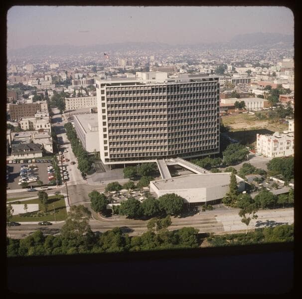 Union Oil Company of California, 1201 West 5th Street, viewed from Bunker Hill. Foreground road that curves to the right is the 4th Street overpass. Left foreground building is the Walgrove Apartments, 427 South Figueroa Street. Left background building with the rooftop sign is Hotel St. Paul, 1021 West 6th Street.