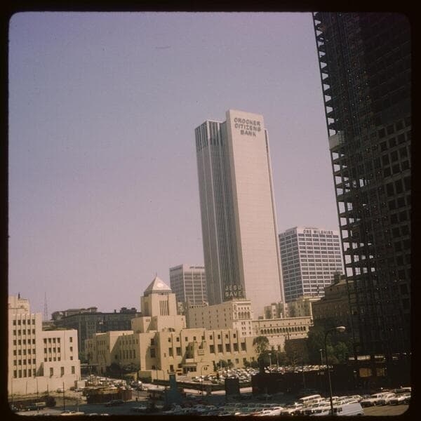 From left to right: Crocker-Citizens Bank; Southland Hotel, 605 South Flower Street; and Atlantic Richfield Plaza construction. 1968 Chevrolet Camaro RS Coupe in the intersection.