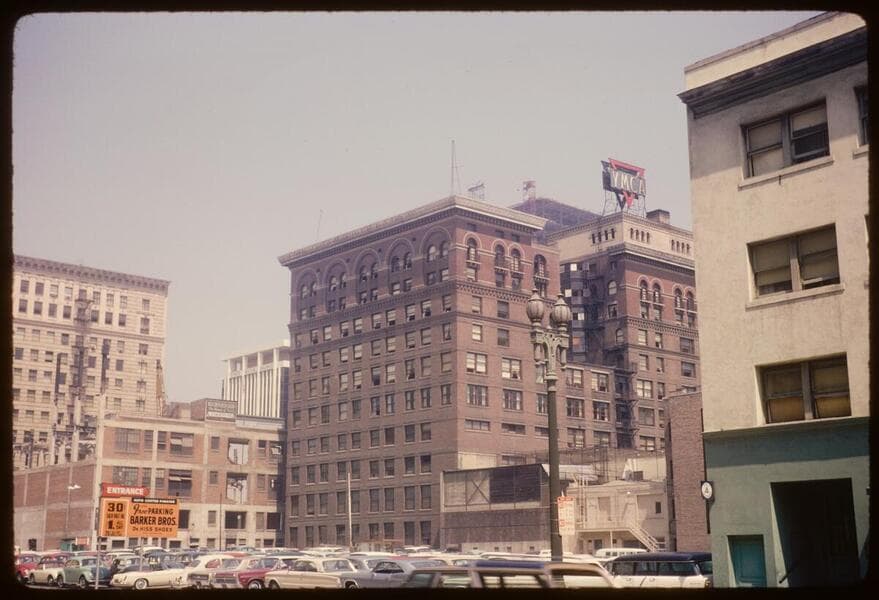 Rear and side view of the YMCA building at 715 South Hope Street. Crocker Citizens Bank skyscraper in the left background.