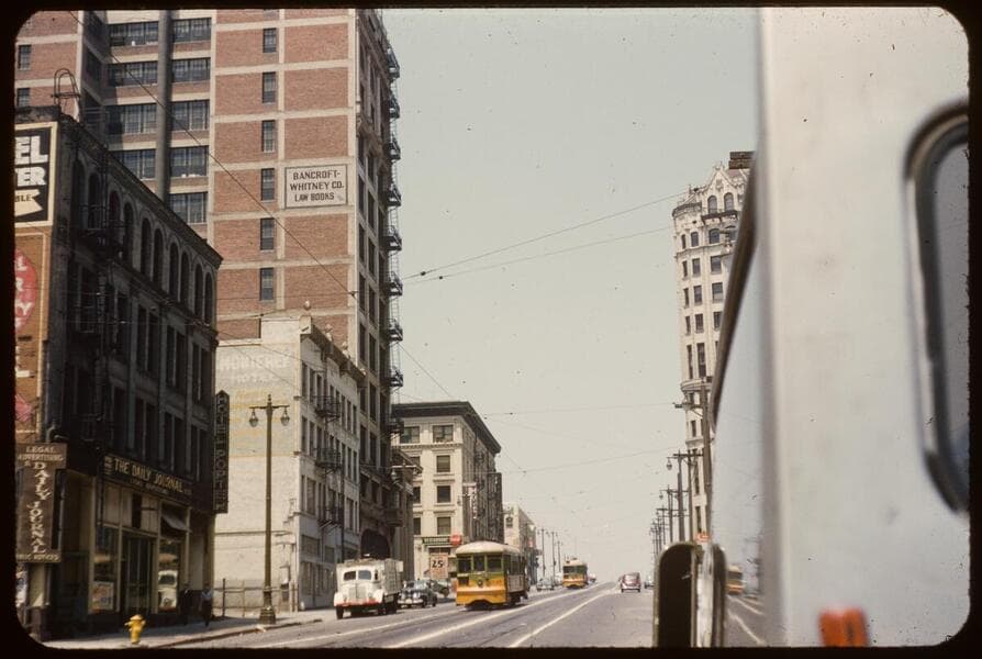 Southeast corner of the 1st Street and Broadway intersection. Bancroft-Whitney Company, publisher of law books, has a place on the 1st Street side. Ogee's restaurant at the corner with Mexico City Cafe to the right. Los Angeles Transit Lines' Line 6 bus going north on Broadway. 1949-50 Ford wagon leaving the intersection at left. Los Angeles Times building complex in surrounding background.