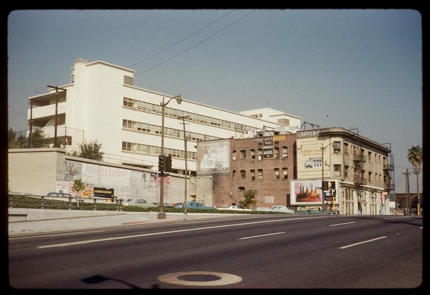 Sentous Block building at 616-620 North Spring Street as seen from the Macy Street intersection, Los Angeles. Hotel Atlantic, Hotel Pacific, and part of Pico House lie to the right in background. Car in the foreground is a 1957 De Soto Fireflite Sportsman.