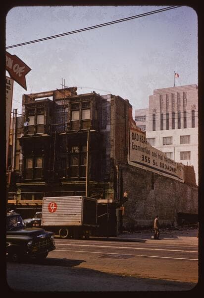 Hellman Building, 223 West 2nd Street, to be demolished by the Cleveland Wrecking Company. Los Angeles Times-Mirror next door and new State Highway Building under construction further down the street.