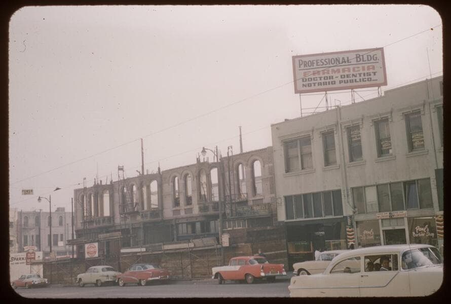Entire square block, encompassed between 1st Street, 2nd Street, Hill Street and Broadway, being leveled. Fashion League Building (formerly Union League Building), on the corner of 2nd and Hill Streets at right, in the early stages of demolition. 1950 Studebaker Commander parked in the red zone.