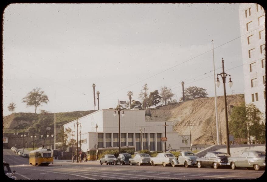 Entire square block encompassed by Broadway, 1st Street, Hill Street, and 2nd Street, being demolished. Arched entrance and side wall of former Los Angeles Police Department's Central Police Station still stand for the moment along 1st Street.