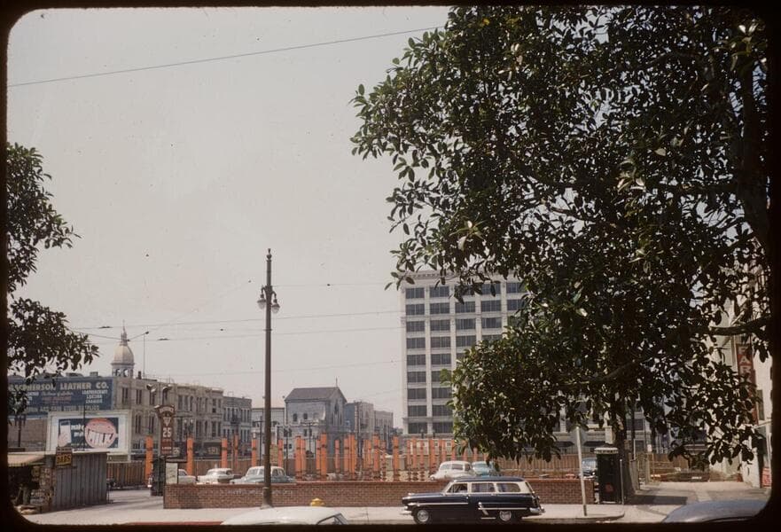 Courthouse being built along 1st Street while 115 South Olive Street housing structure has been demolished. 1956 Chevrolet 210 parked in the driveway by the remnants.