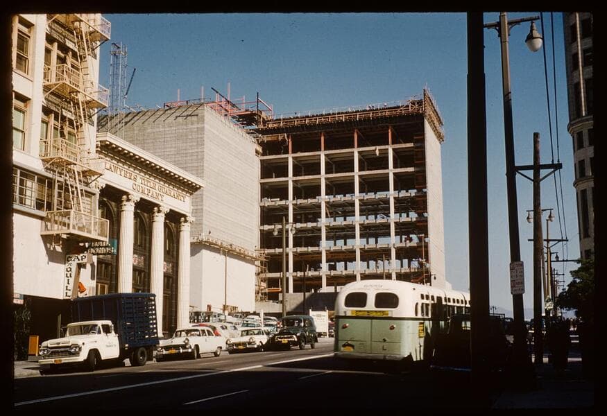 Haig M. Prince Building, 145 South Broadway. The turreted Roanoke Building to the right offered office space. Nine floor California State Office Building under construction at right with steel I-beams from Bethlehem Pacific Coast Steel.