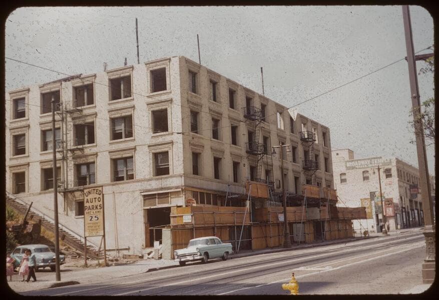 Entire square block, encompassed between 1st Street, 2nd Street, Hill Street and Broadway, being leveled. Fashion League Building (formerly Union League Building), on the corner of 2nd and Hill Streets at right, in the early stages of demolition. 1950 Studebaker Commander parked in the red zone.