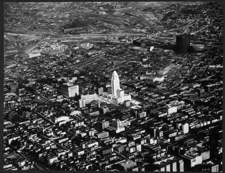 Aerial view of the Civic Center and surrounding buildings in downtown Los Angeles, California, showing the Los Angeles City Hall at 200 North Spring Street at center, with the Los Angeles County Hall of Records (with divided top stories) directly behind it at center, and across Temple Street, the United States Courthouse at center right, and Los Angeles County Hall of Justice at upper right. The edge of the Los Angeles Times building is at far left on the corner of Spring and First Streets. Bunker Hill can be seen in the background.
