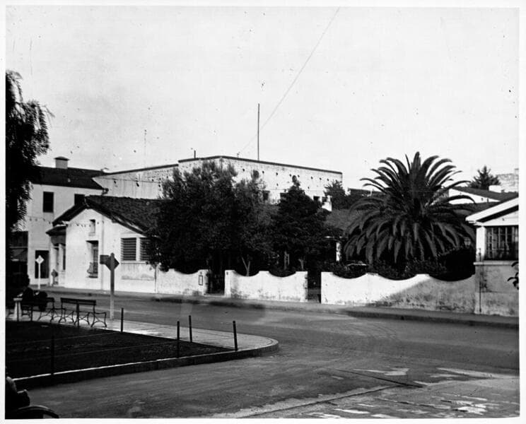 Image of a woman hanging laundry on the clothesline at the Casa de la Guerra adobe house and buildings in Santa Barbara, California. A bird house is seen on top of a pole at left and a century plant is seen blooming at center.