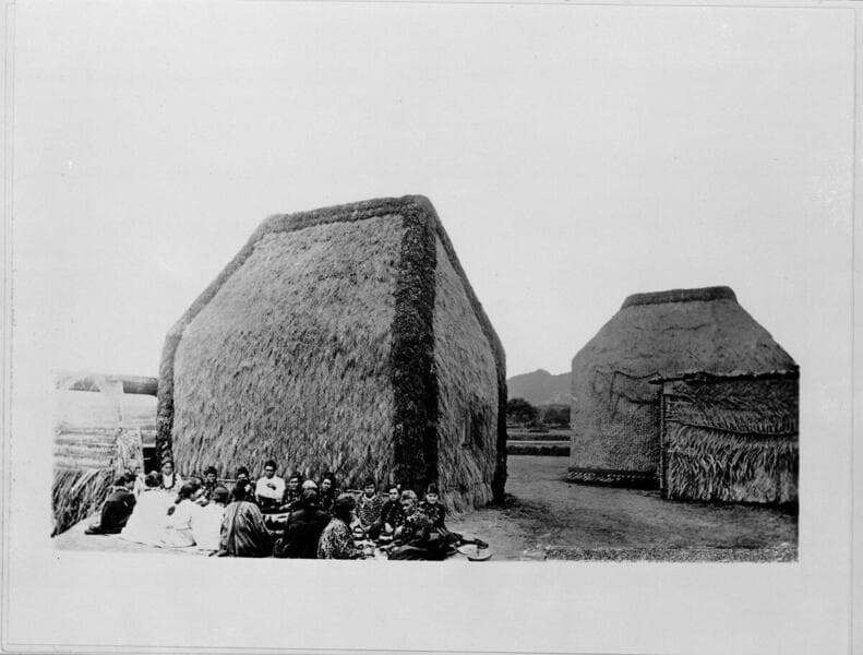 Group of people, standing and seated, outside of adobe structure