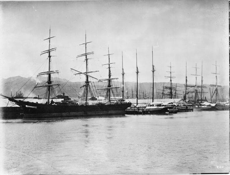 [Pierce 05662 -05667 forms a panorama]. View of docks with sailing ships.