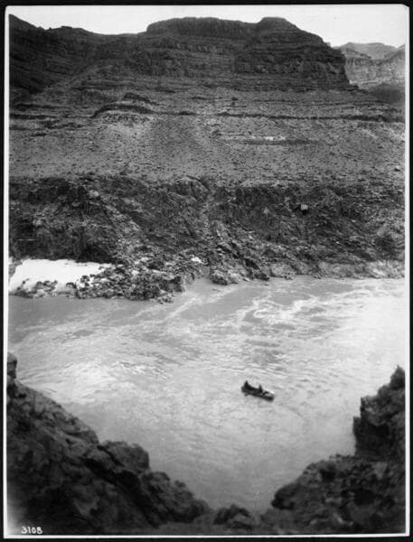 A view of a dory with a single man on the Colorado River in Glen Canyon.
