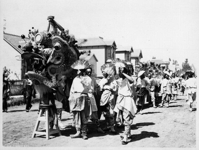Paper dragon carried by Los Angeles Chinatown citizens in parade, 1901