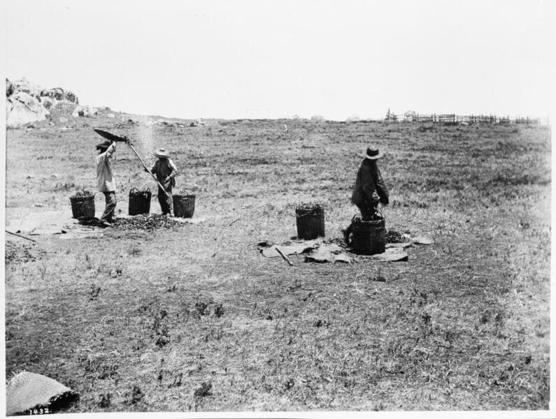Winnowing wheat and pounding flour, Mission Indians