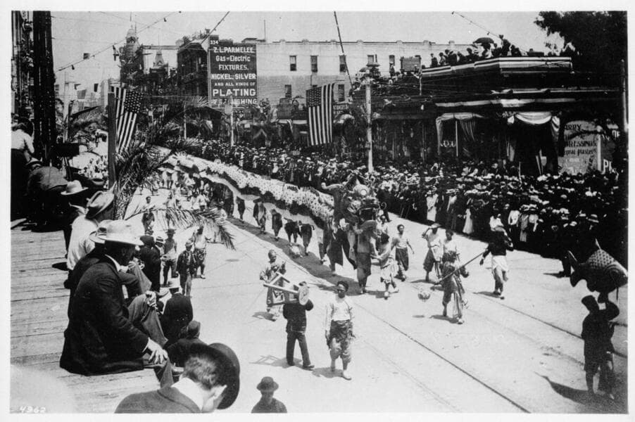 Paper dragon carried by Los Angeles Chinatown citizens in parade, 1901