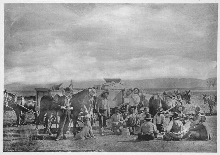 15 men eating lunch and drinking beer on a rock beside a lake in the Big Creek area.