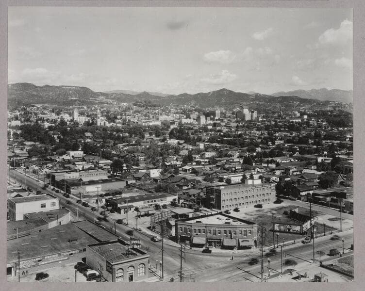Image of an aerial view of Hollywood Boulevard in Hollywood, California, with the Hotel Christie, First National Bank Building (with tower, at center at the intersection with Highland Avenue), Grauman's Chinese Theatre, Hollywood Roosevelt Hotel, and the Equitable, Taft Building, and Broadway Building in the distance. The view extends from about La Brea Avenue east