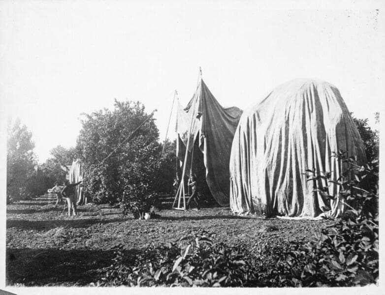 A group of men with oranges and crates in an orange grove. There are ladders against two trees and a wagon in the background with two horses and a driver.