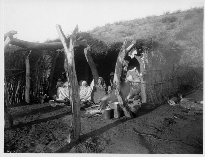 A portrait of a group of Yaqui Indians in a brush hut.