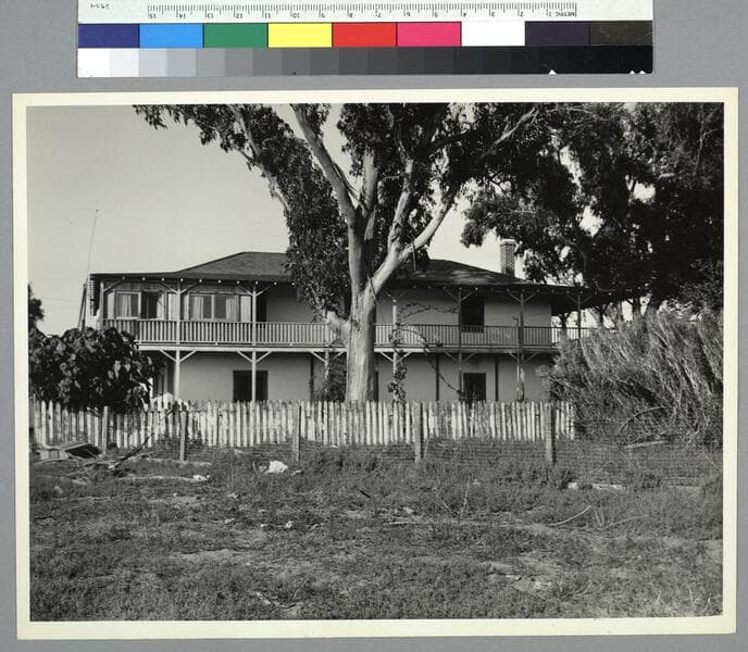 The two-story home of Nathaniel C. Carter on his Willow Dale estate in San Gabriel (now San Marino, California), with a long porch and a garden bordered with a picket fence and rows of grape vines in front of it. A man and a woman stand on porch, a woman on horseback is near the side of house, and a cat rests near the driveway.