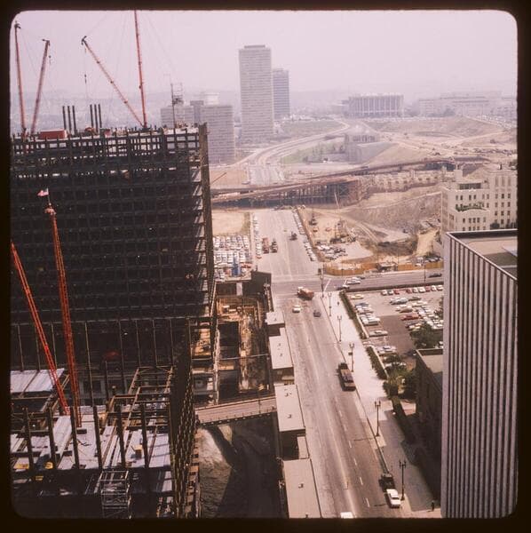 This collection consists of 35mm Kodachrome slides taken between 1954 and 1972. This collection of photographs taken by amateur photographer Palmer Conner documents by street the physical and social changes of Bunker Hill during the earliest stages of redevelopment. The collection is particularly strong in its depiction of the Bunker Hill neighborhood of downtown Los Angeles during redevelopment in the 1950s. Images chiefly consist of views of commercial and residential building exteriors taken from the street, including images of both new construction and older buildings in the process of being demolished.